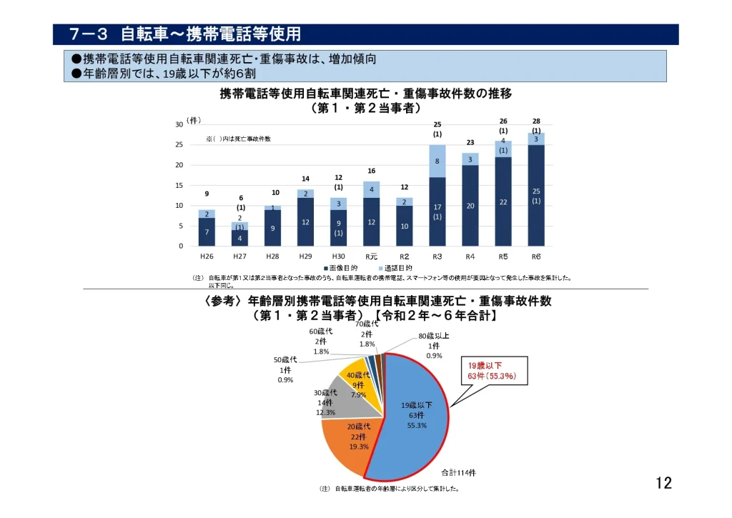 警察庁の調査によると、携帯電話の使用に関連した自転車の死亡・重症事故は年々増加しており、当事者の6割以上は19歳以下であることが分かっています。