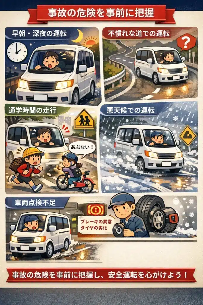事故防止の基本は、「時間帯・ルート・天候・車両状態」というリスク要因を事前に把握し、運行計画に反映させることです。