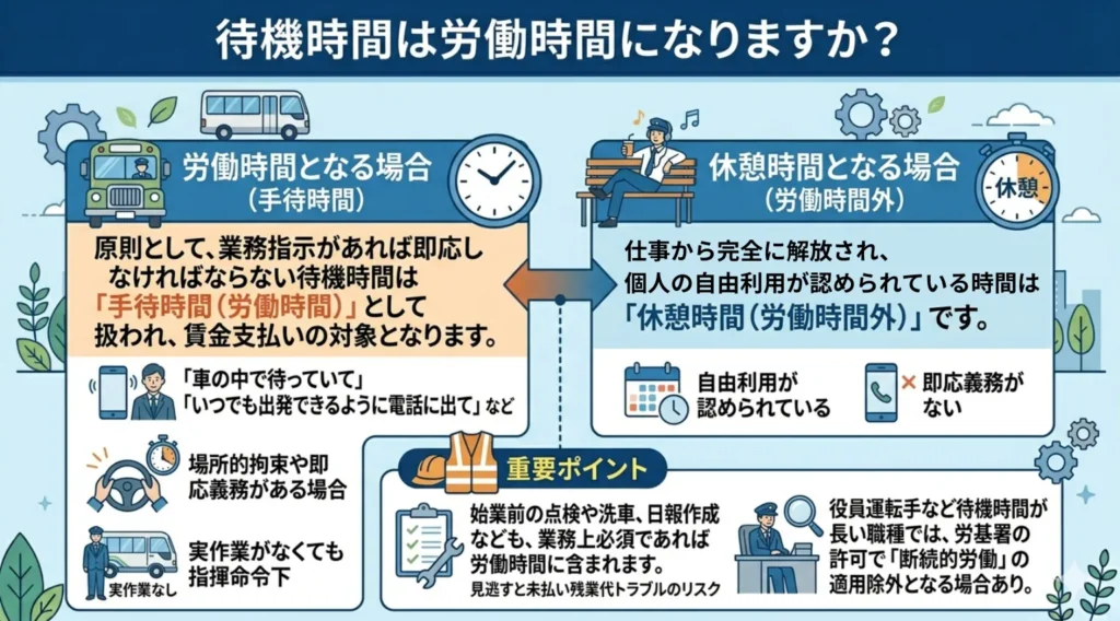待機時間は、その内容によって「労働時間」として扱われるかどうかが決まります。