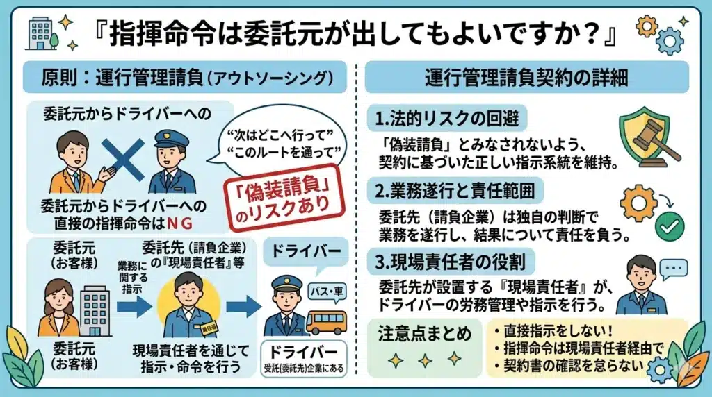 原則として、送迎業務を「運行管理請負(アウトソーシング)」で依頼している場合、委託元(お客様)がドライバーへ直接の指揮命令を出すことはできません。指揮命令権は、雇用主である受託(委託先)企業が持ちます。